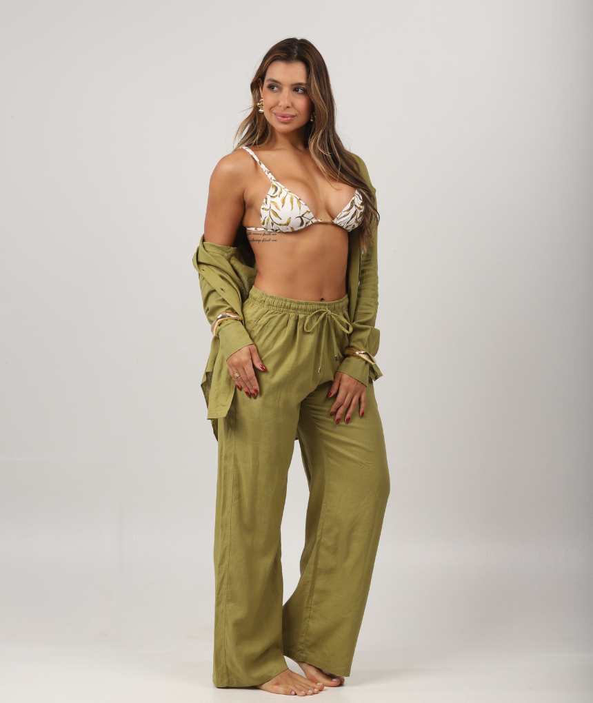 • Confeccionada em tecido misto de viscose, poliamida e linho