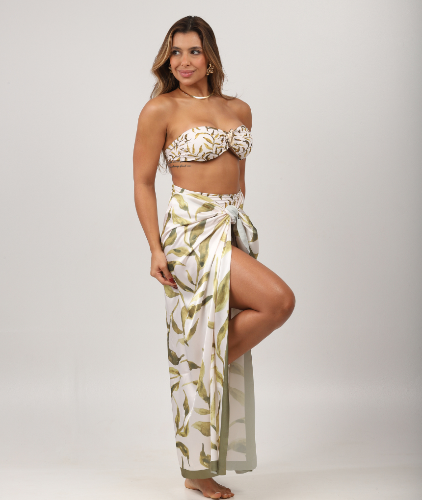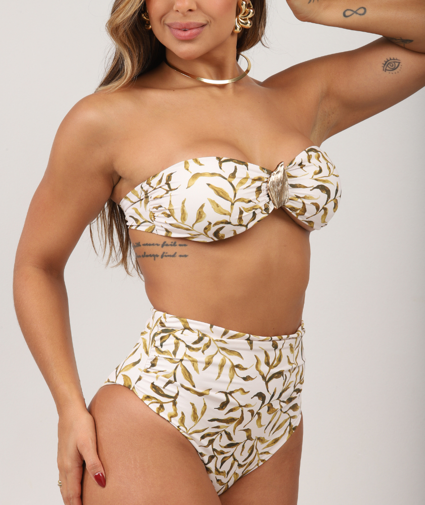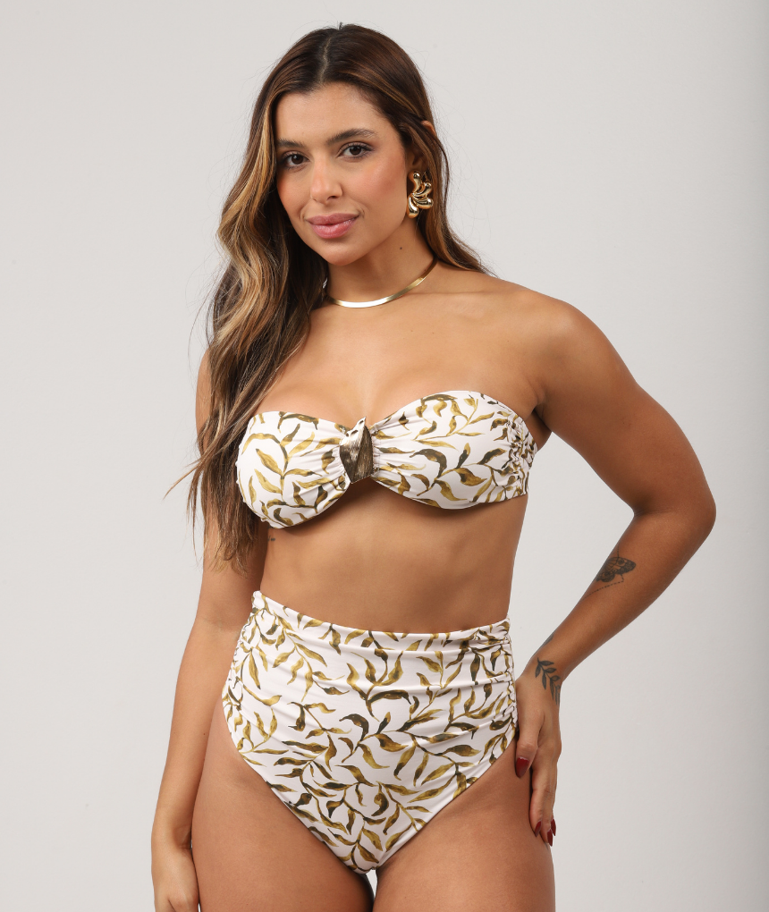O top Ale tomara que caia é descolado e diferenciado, o seu detalhe dourado em folha agrega delicadeza e sofisticação à peça. É o melhor amigo do seu guarda-roupa, pronto para te acompanhar em todos os looks beach wear. Esse modelo está no topo das tendências e nunca sai de moda, permitindo que você crie várias combinações de looks!